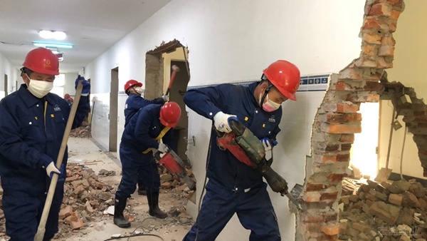1月27日,大年初三早上8時整,一支由宏盛建業(yè)60多名專業(yè)管理和施工人員組成的施工隊伍,準時到達上饒市第二人民醫(yī)院,全面展開拆建施工。